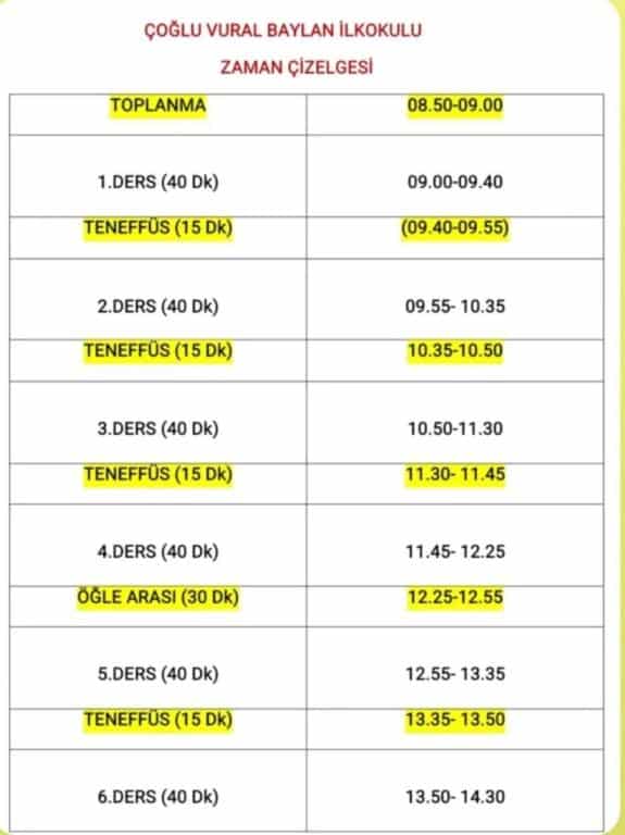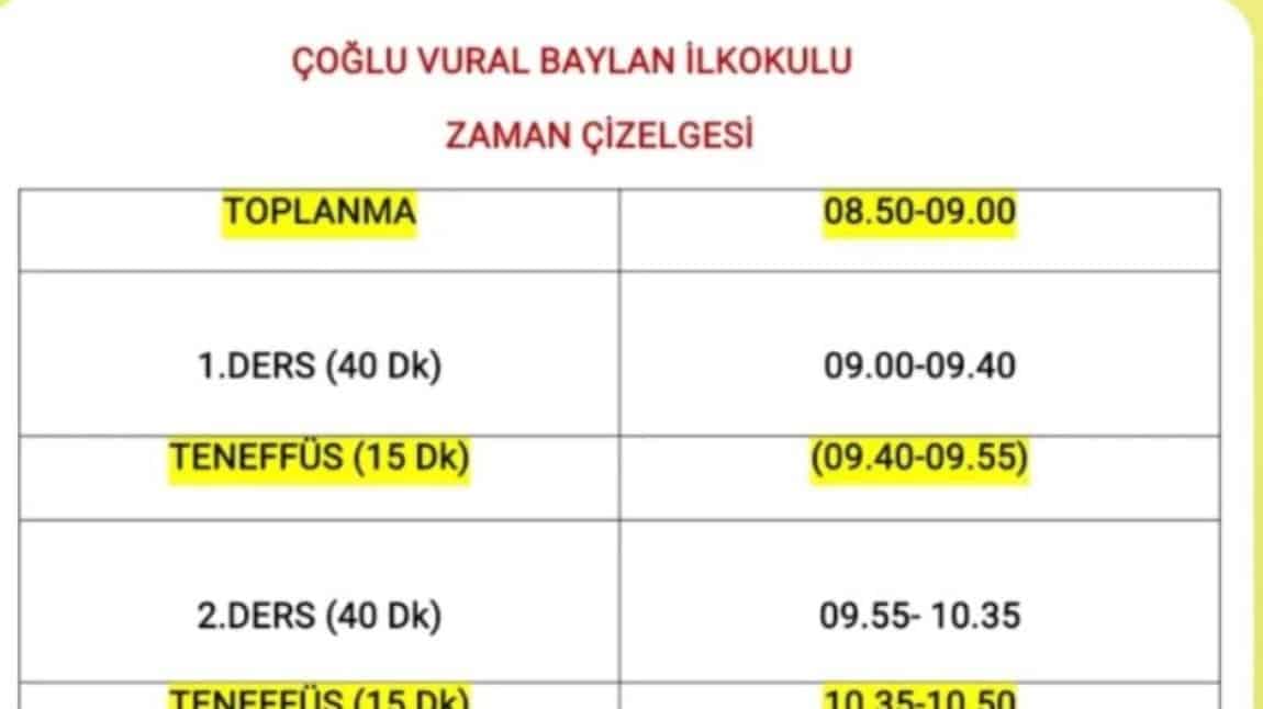 ÇOĞLU VURAL BAYLAN İLKOKULU ZAMAN ÇİZELGESİ